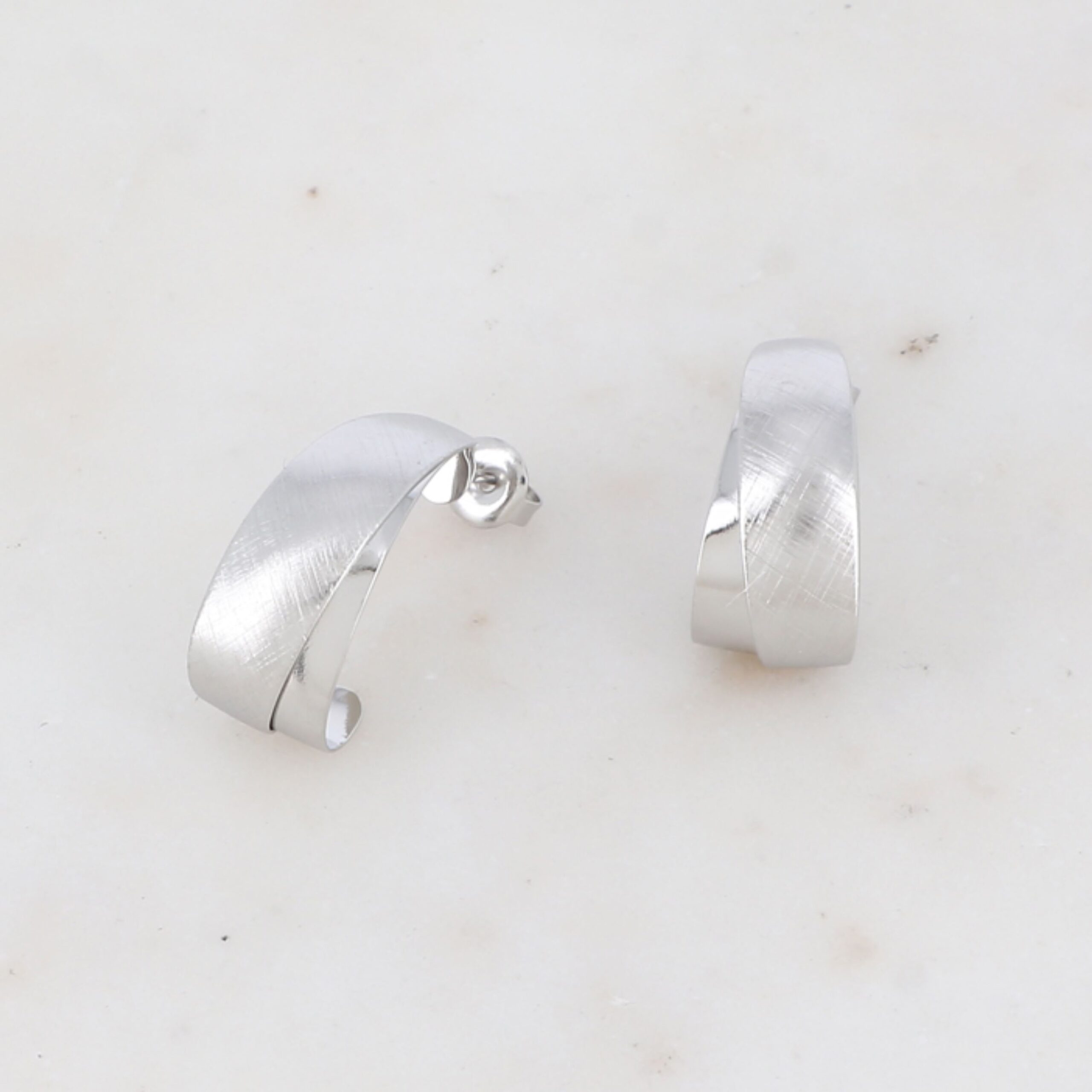 Boucles d’oreilles de type créoles à puce double rangs bi-textures: lisse et brossé. Fermoir papillon.