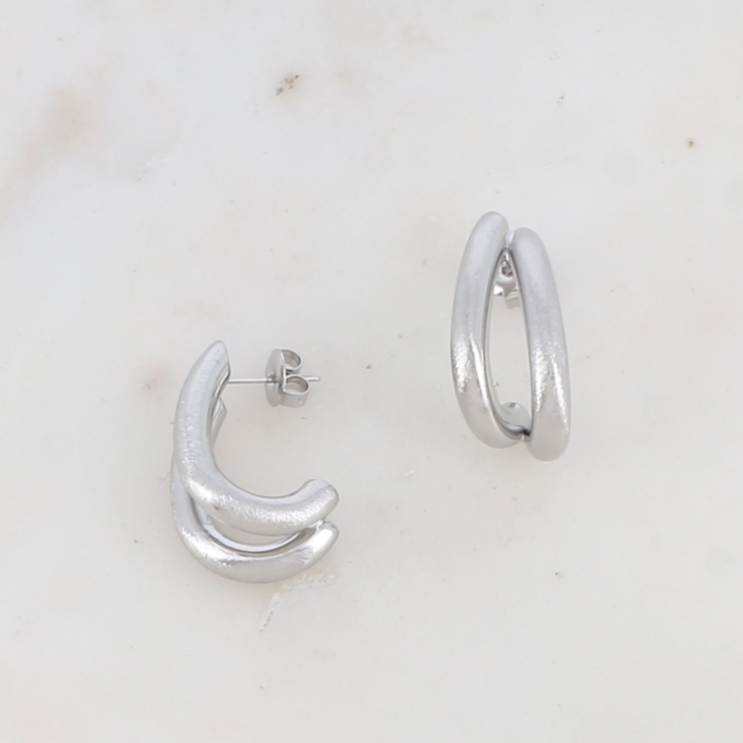 Boucles d’oreilles de type créoles à puce double rangs avec un effet brossé. Fermoir papillon.