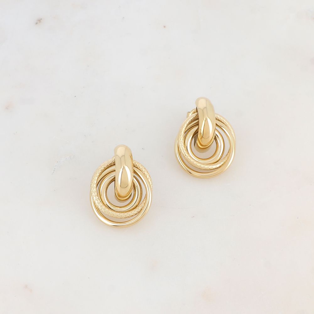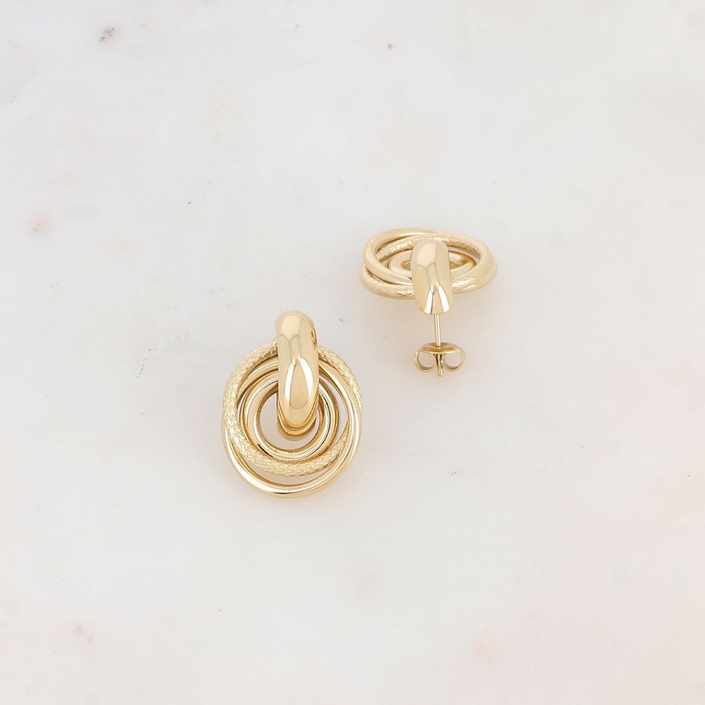 Boucles d’oreilles à puce composées de trois anneaux : lisses et texturés.