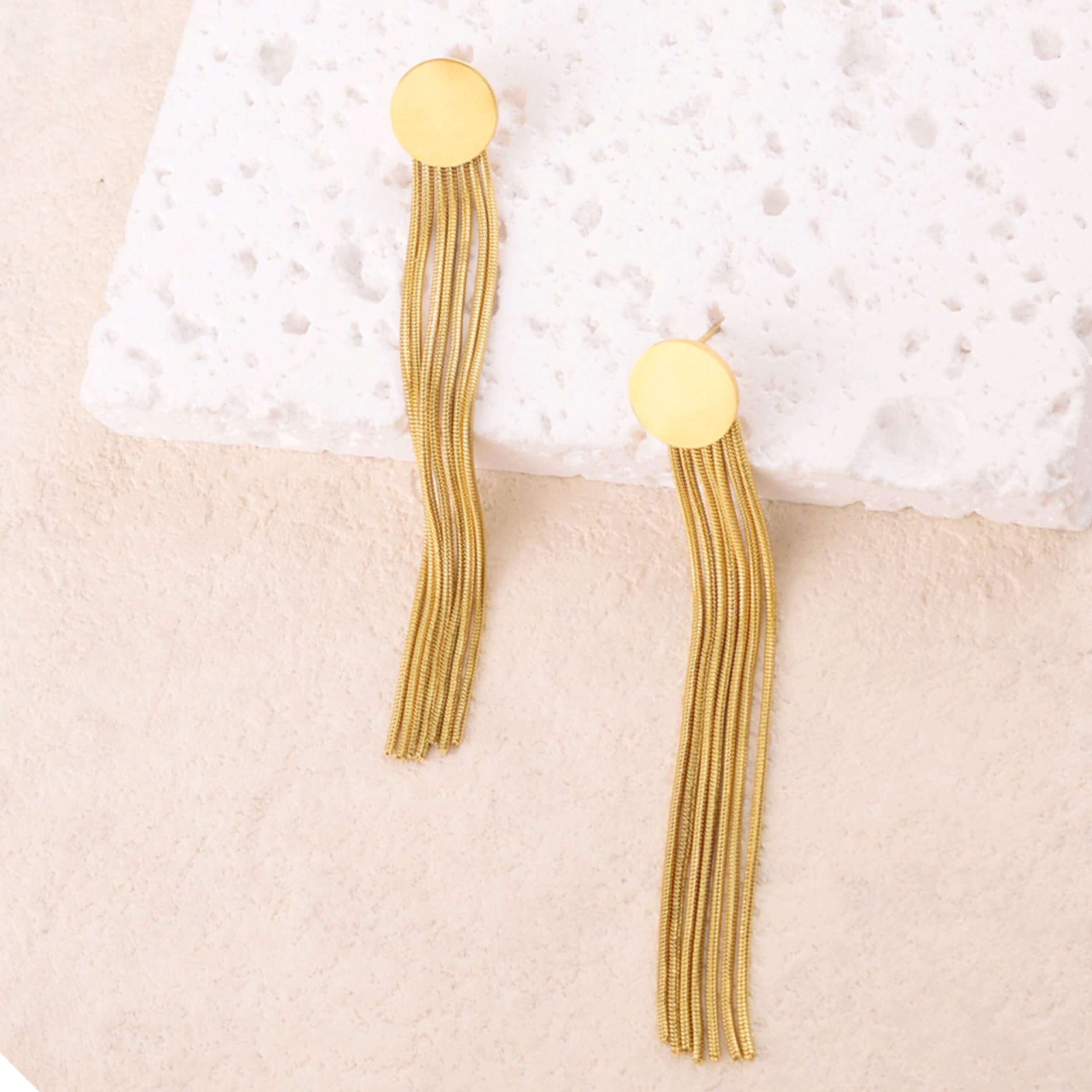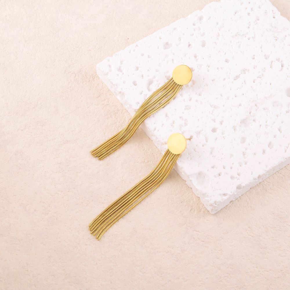 Boucles d’oreilles à puce composées d’une pièce ronde lisse effet miroir et de 7 chaînes tombantes. Fermoir papillon.