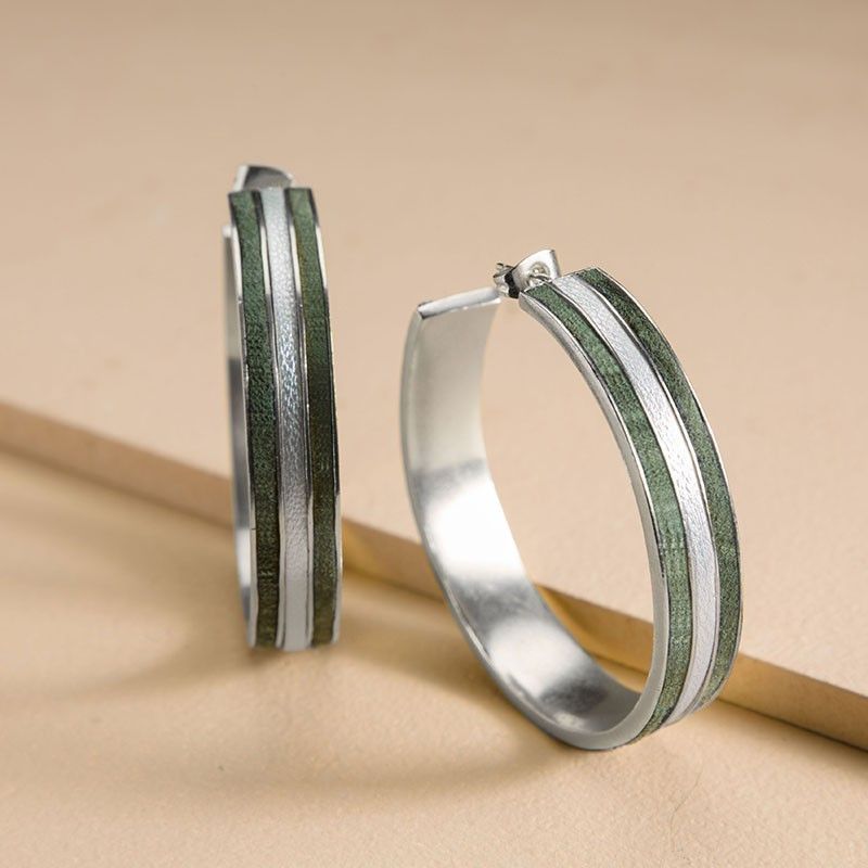 Créoles composées de 3 bandes de cuir véritable argenté et vert