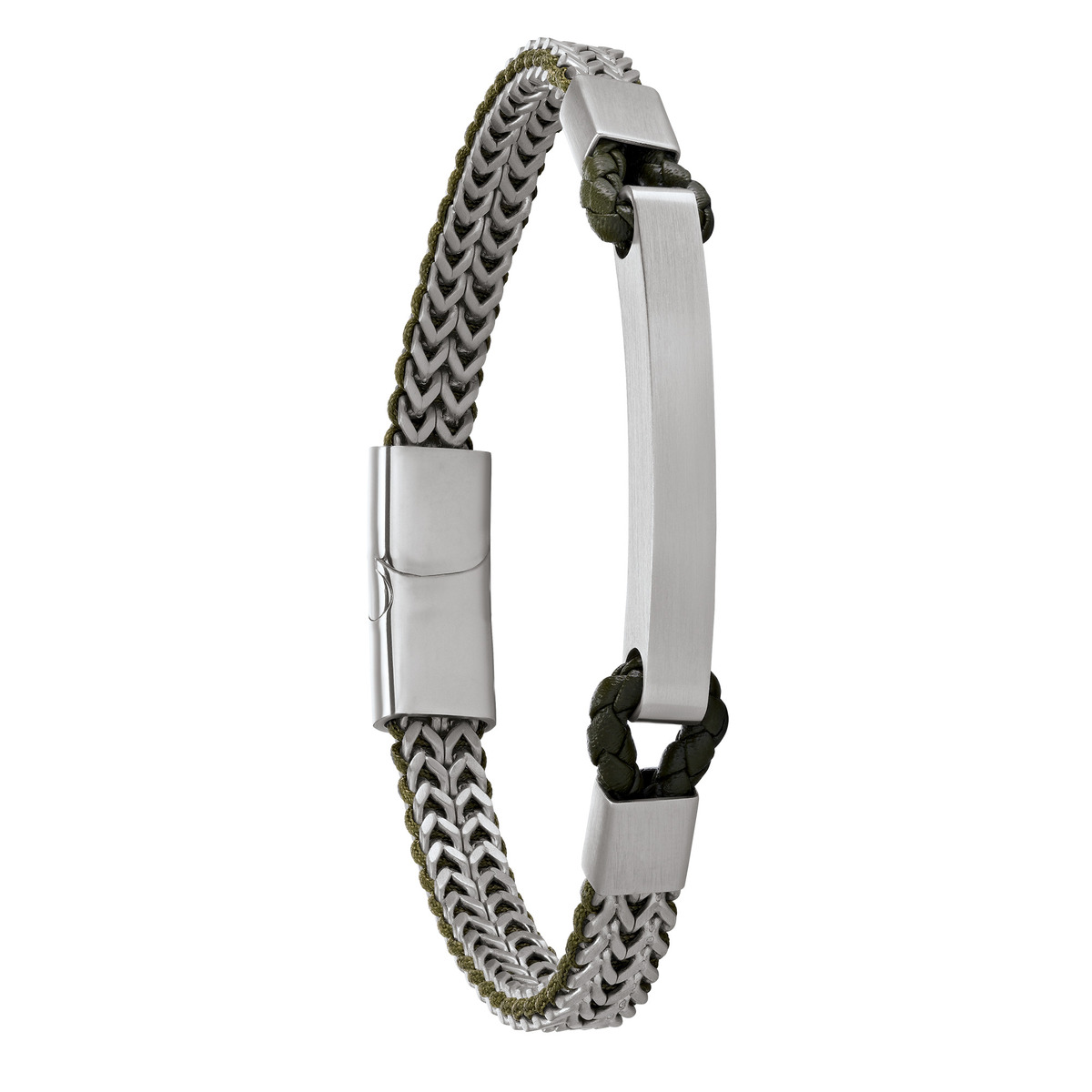 Bracelet gourmette maille acier chevrons, cordelette tissu et cuir tressé kaki.