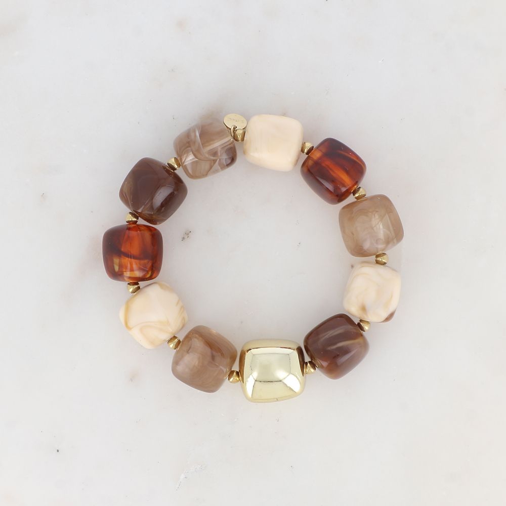 Bracelet élastique orné de perles en résine et d’une perle métallique.