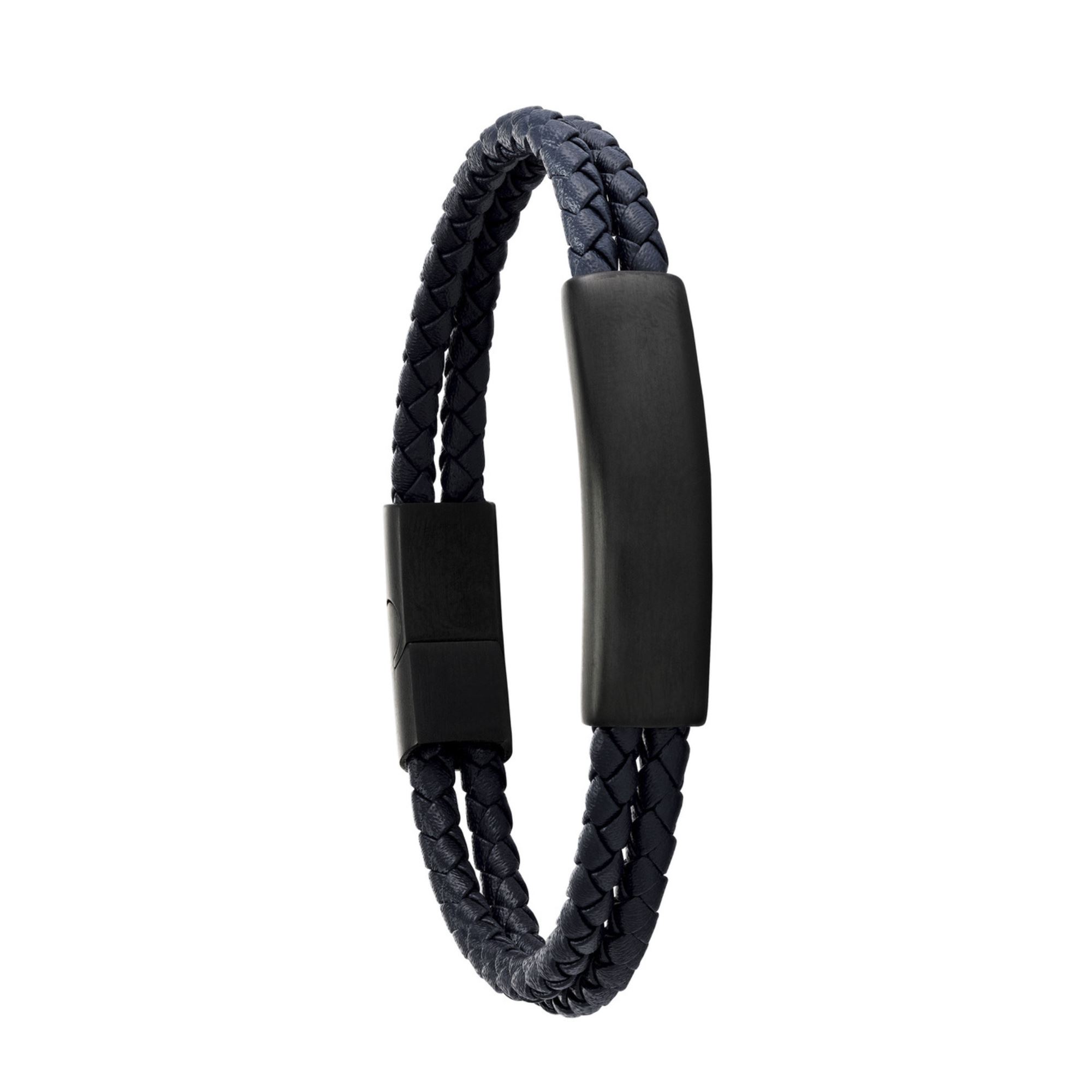 Bracelet « Côme », double cuir bleu et plaque acier PVD noir, Jourdan