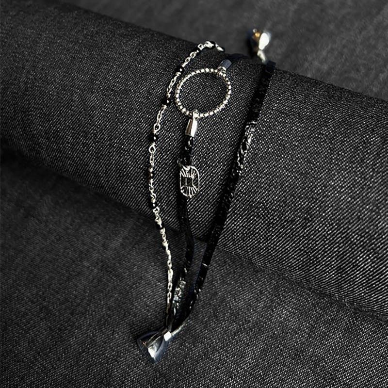 Métal argenté base laiton, cuir noir, perles d’agates