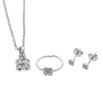 Coffret enfant, argent, collier 42 cm, bague et boucles d’oreilles puces, motif fleurs