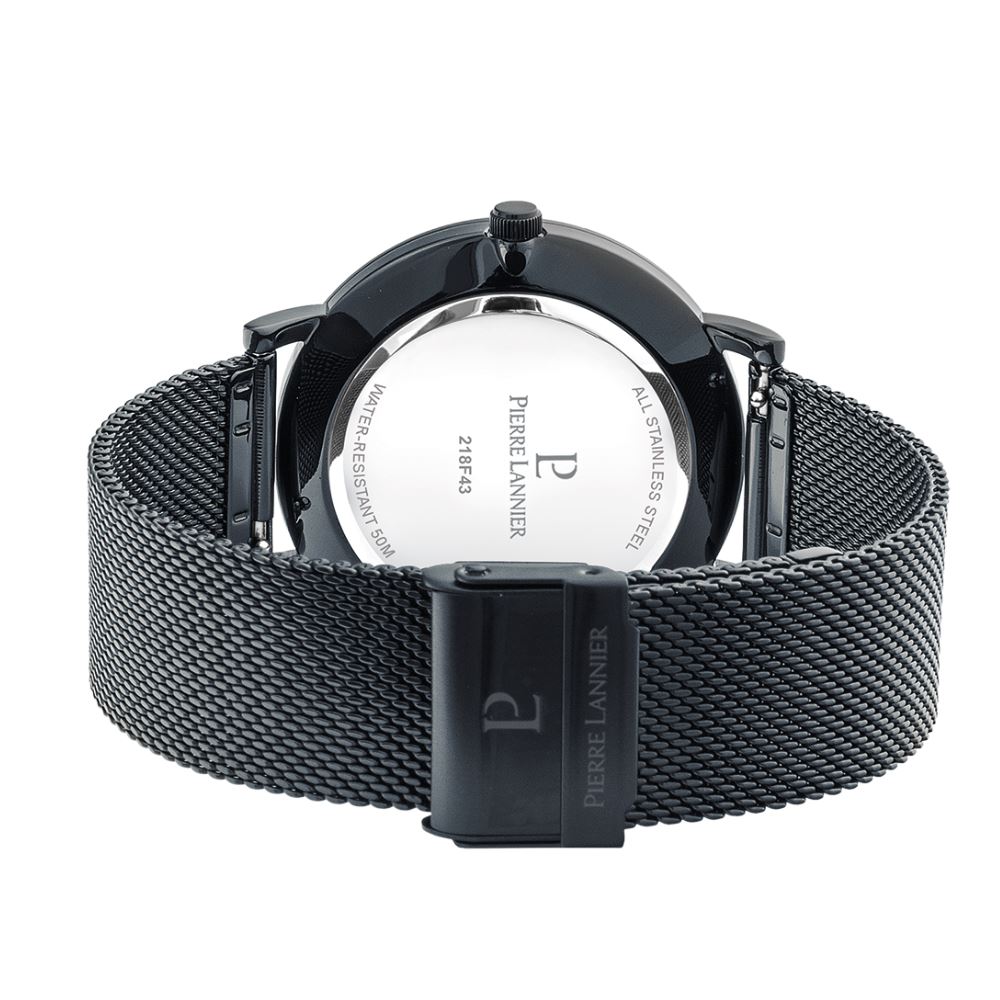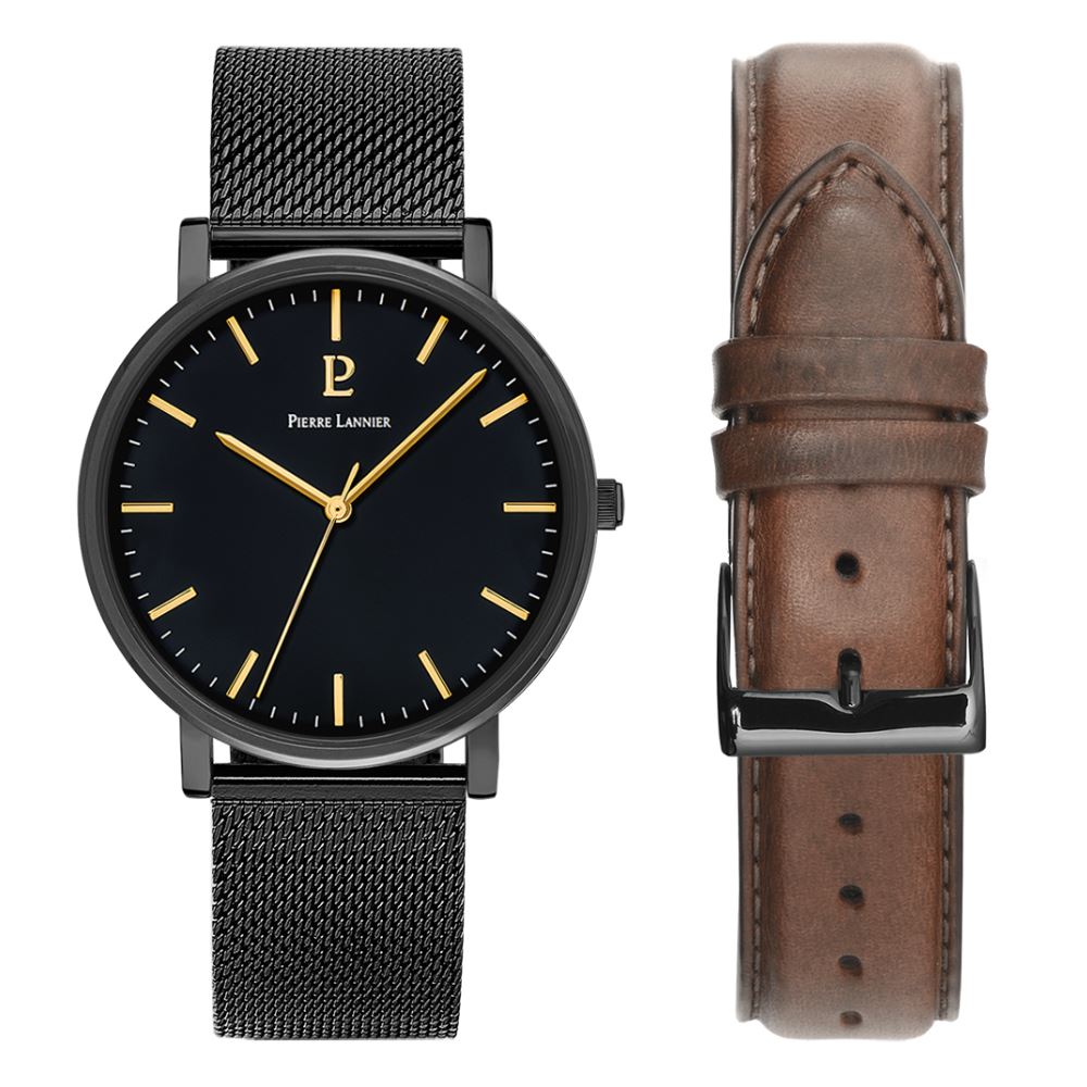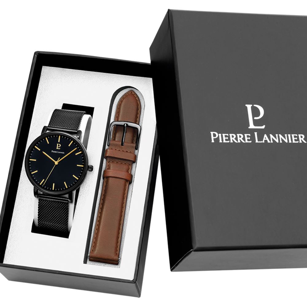Coffret montre acier Ø 40.5 mm, bracelet acier noir + cuir marron, Pierre Lannier