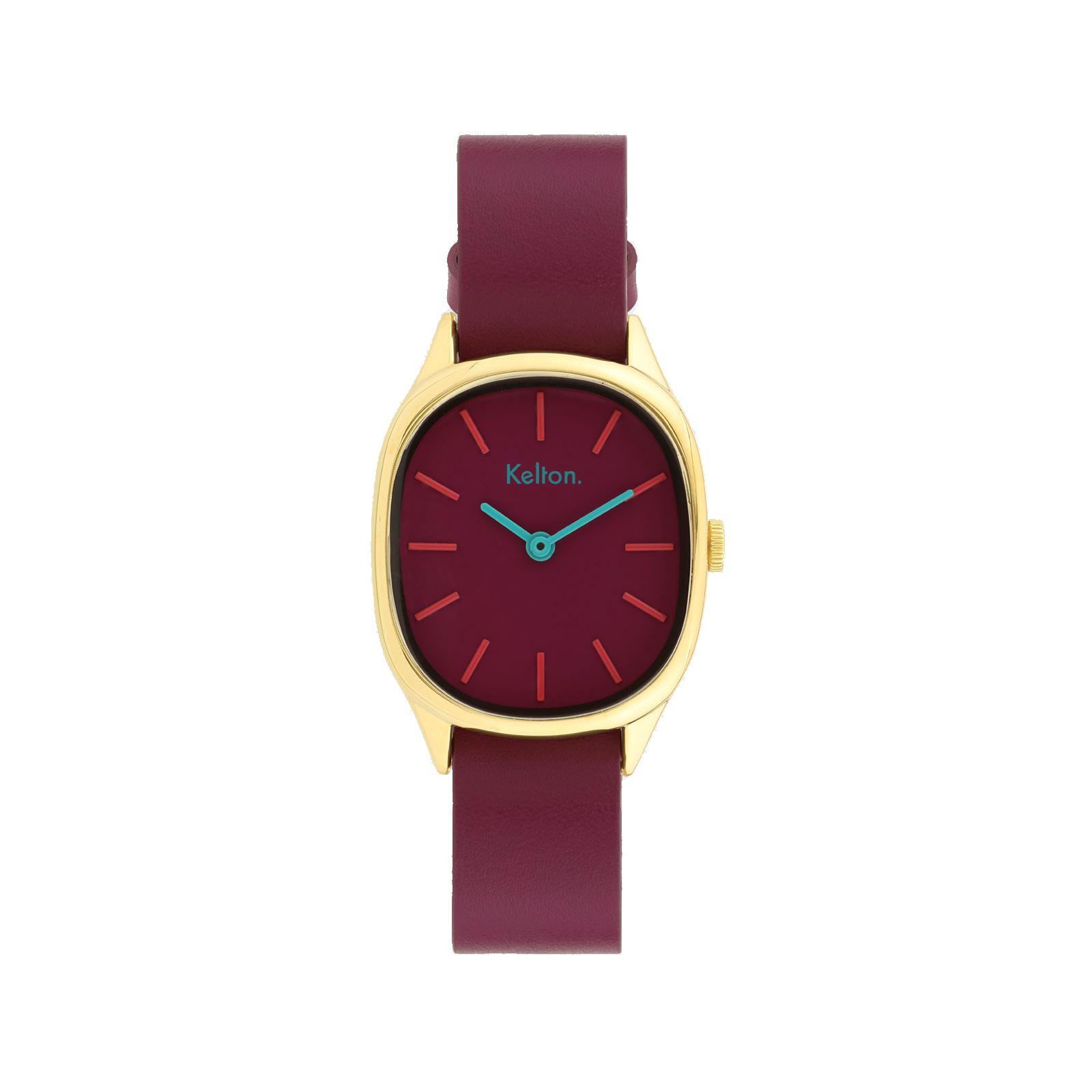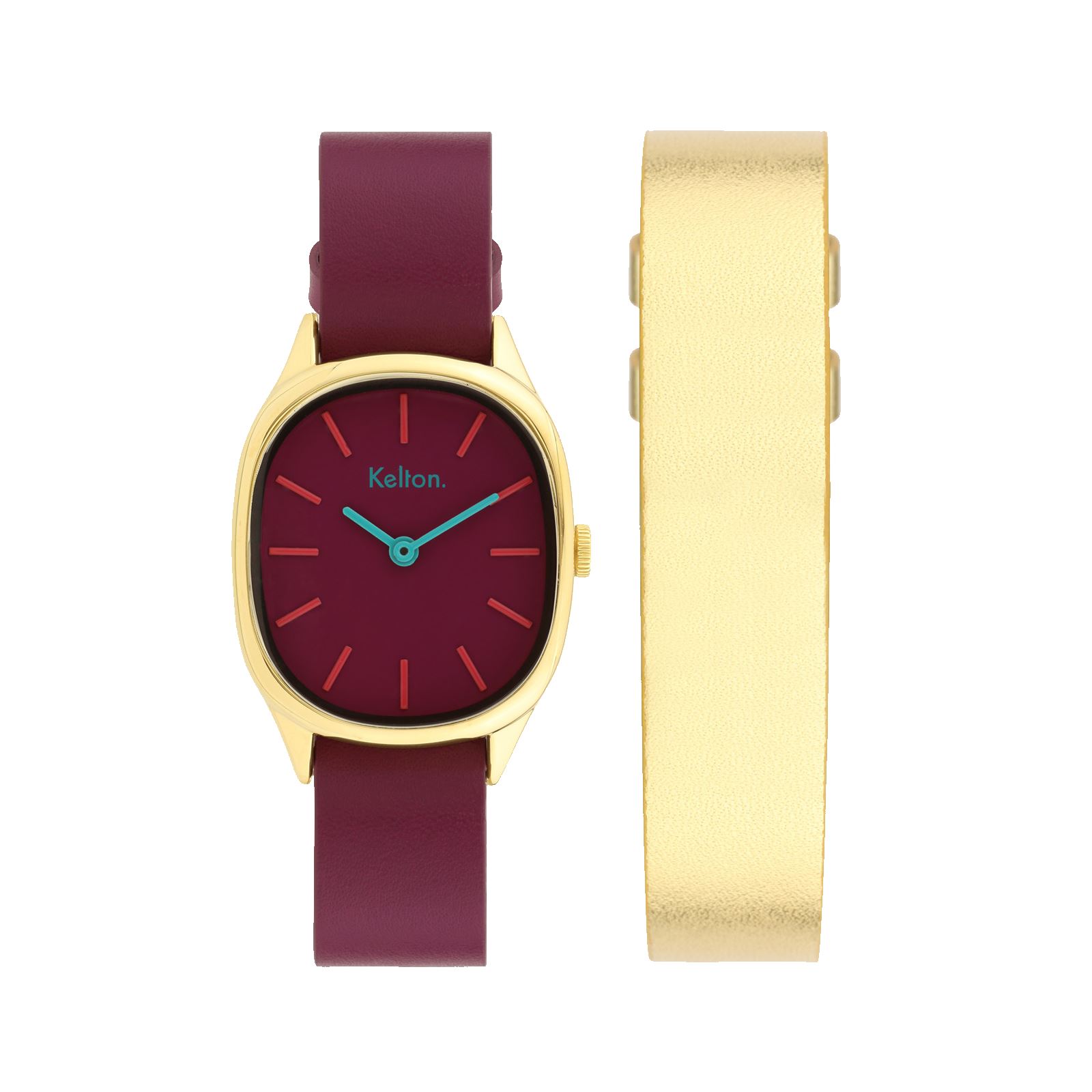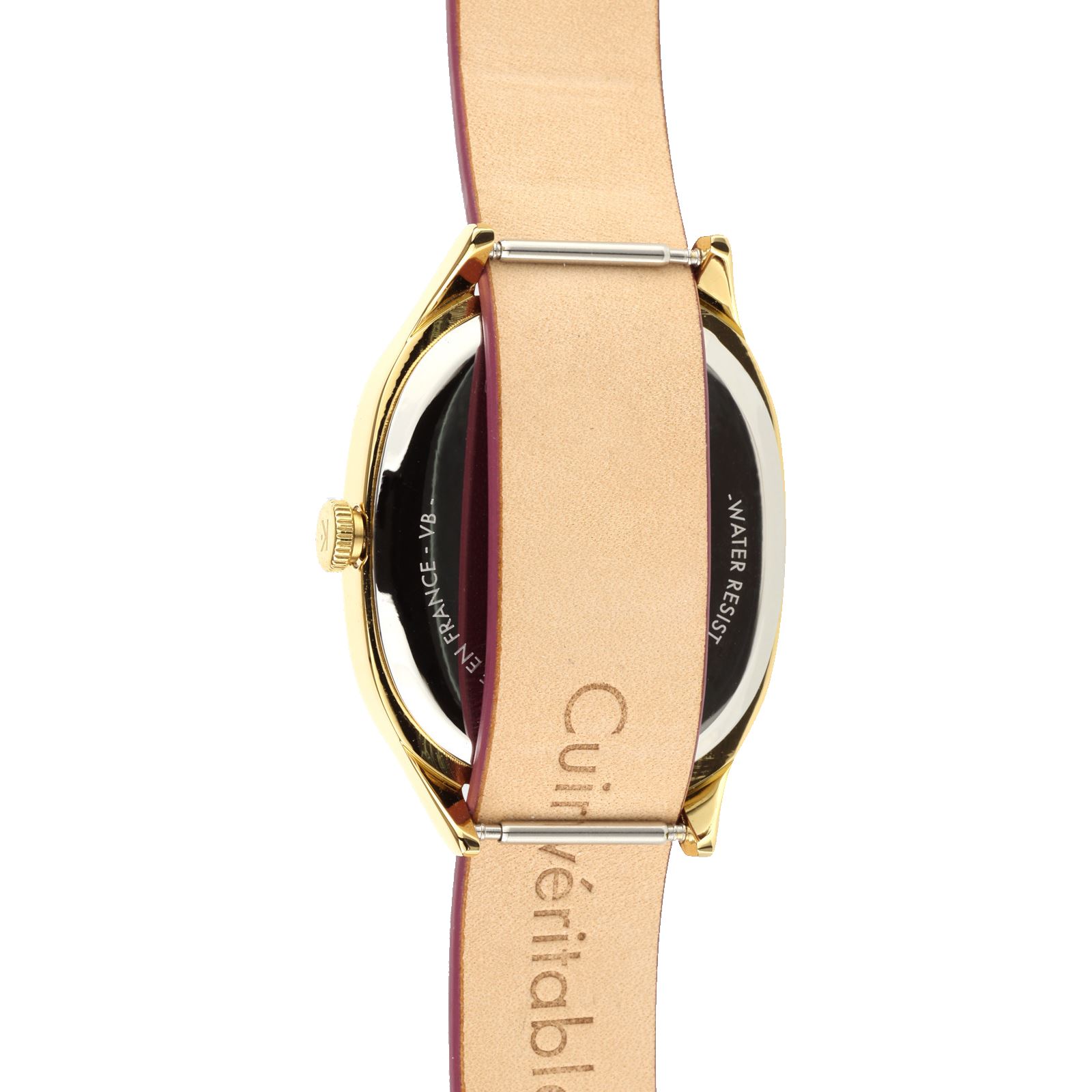 Boitier laiton doré 28/32 mm, cuir prune + 2ème bracelet nato cuir doré métalisé