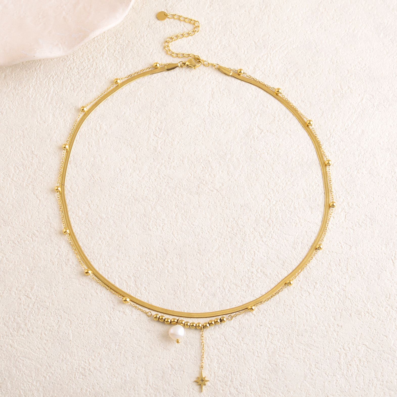 d’une étoile de Nord et d’une perle d’eau douce. Fermoir mousqueton et chaînette réglable.
