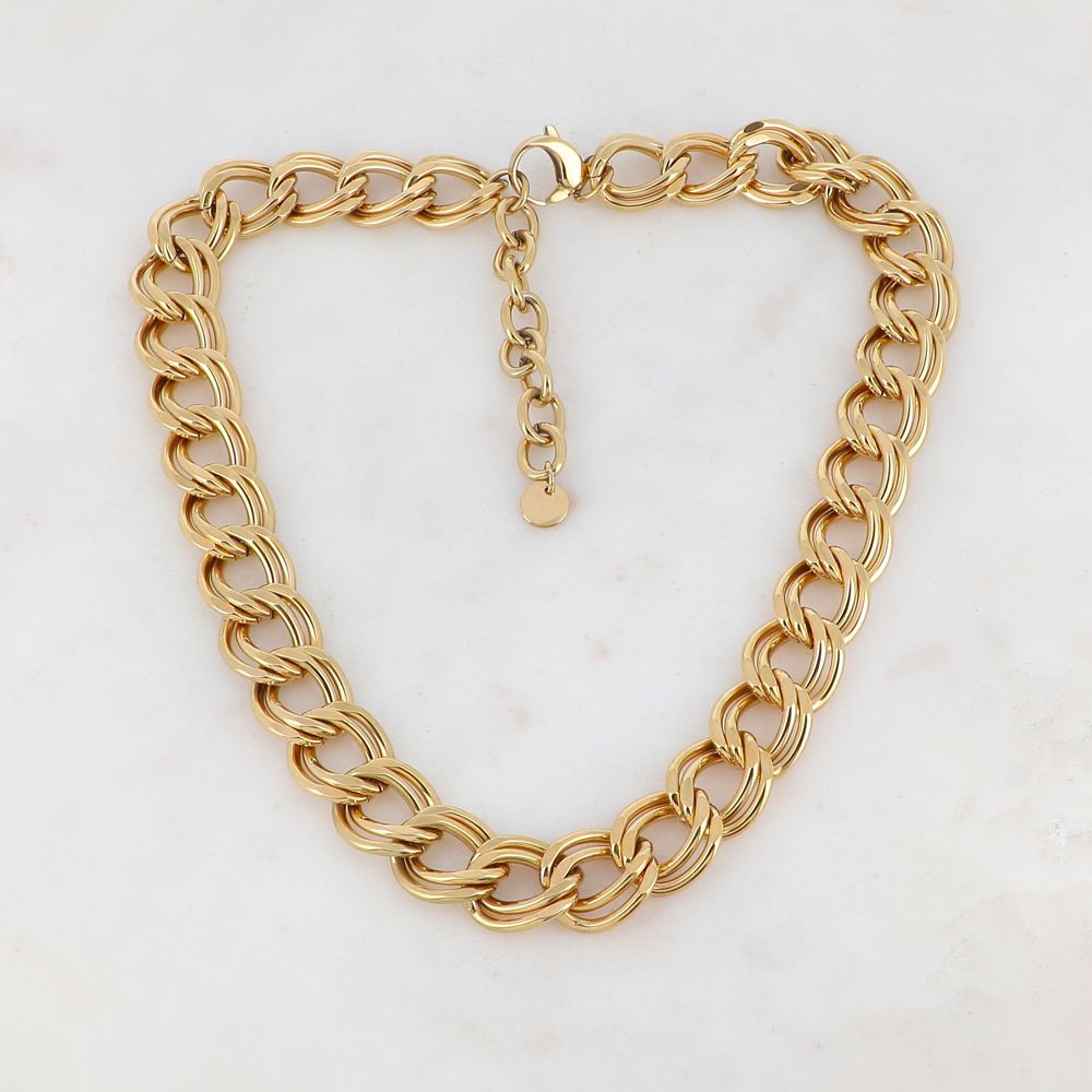 Collier en double maille plate. Fermoir mousqueton et chaînette réglable.