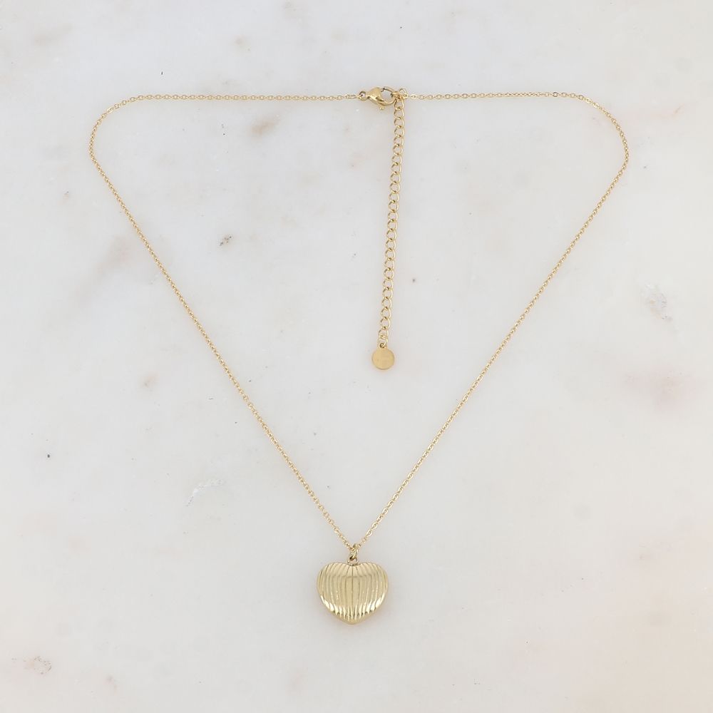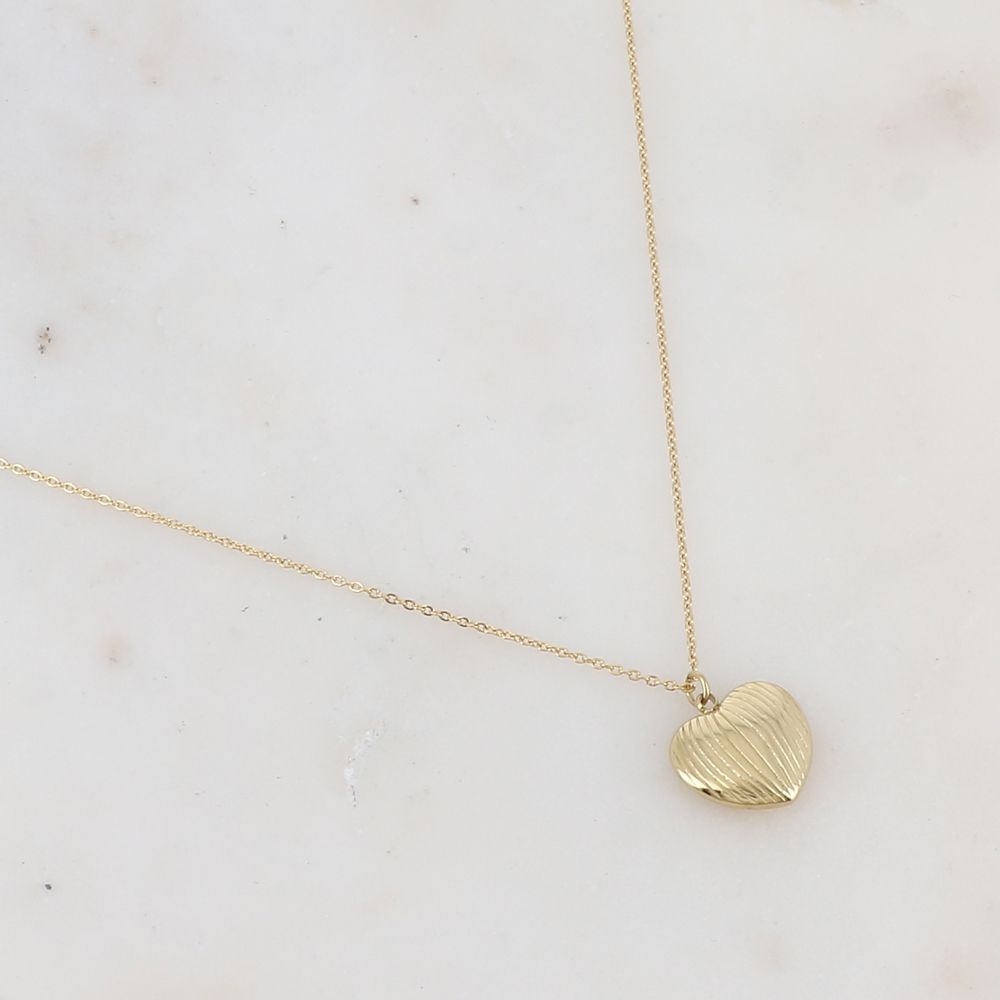 Collier sur chaine composé d’un pendentif forme cœur texturé. Fermoir mousqueton et chaînette réglable.