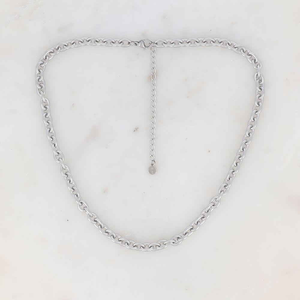 Collier en maille sur chaîne. Fermoir mousqueton avec chaînette réglable.