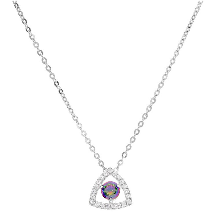 collier Argent 925/000, chaine maille forçat 45 cm réglable à 42 cm, pendentif motif triangle serti d’oxydes de zirconiums blanc, au centre un zirconium mystique.