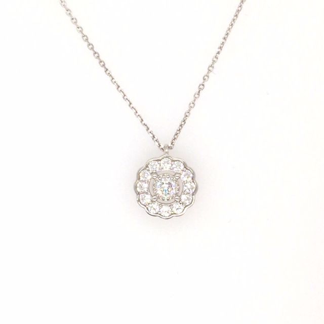 Collier Or Blanc 375/000,  Chaine Maille Forçat, Pendentif Rond 10 mm, Style Fleur Entourage Oxydes de Zirconiums