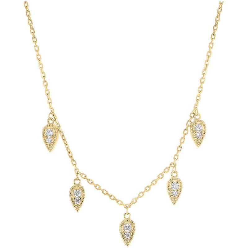 Collier plaqué or 5 pampilles, duo d’oxydes de zirconiums sur chaque feuille.