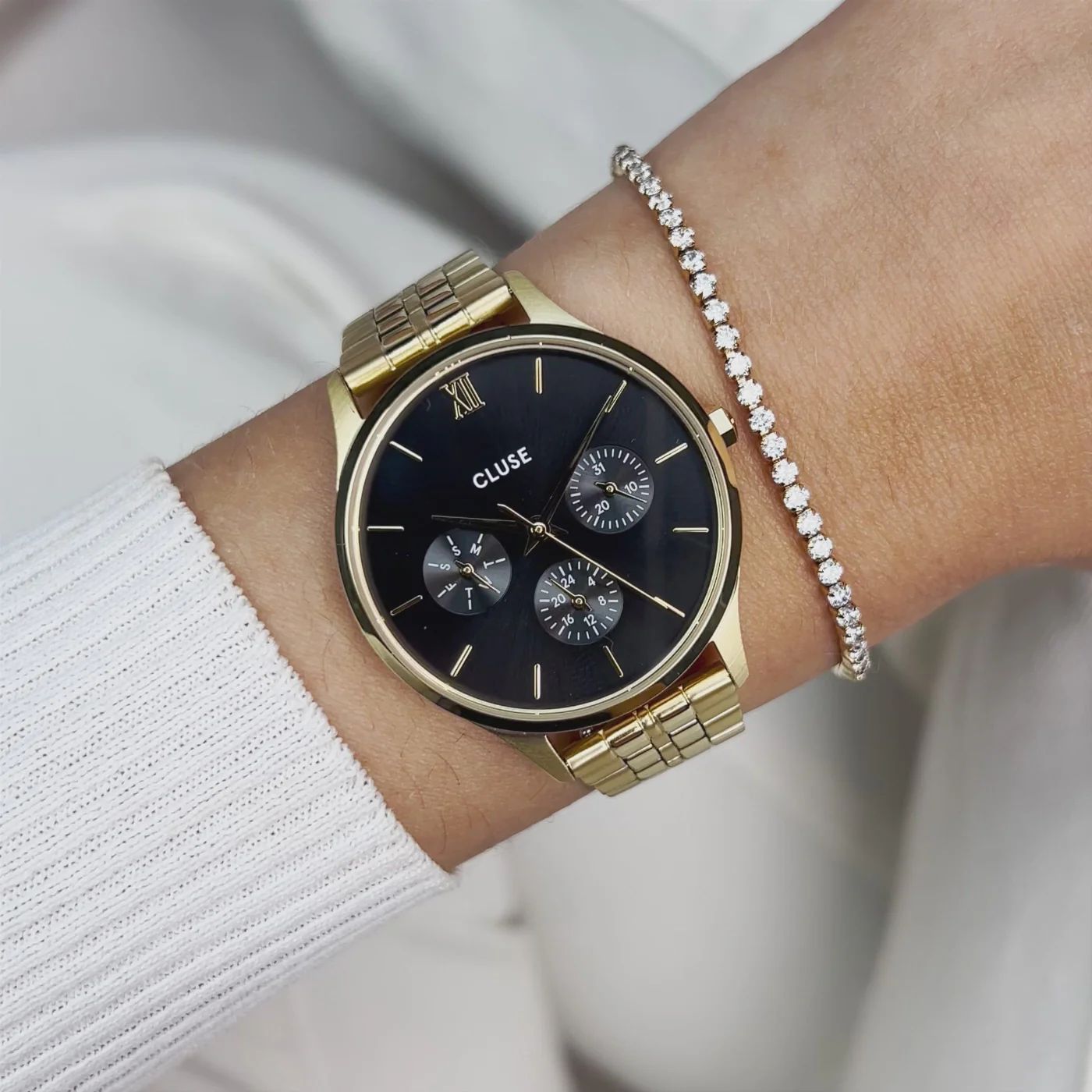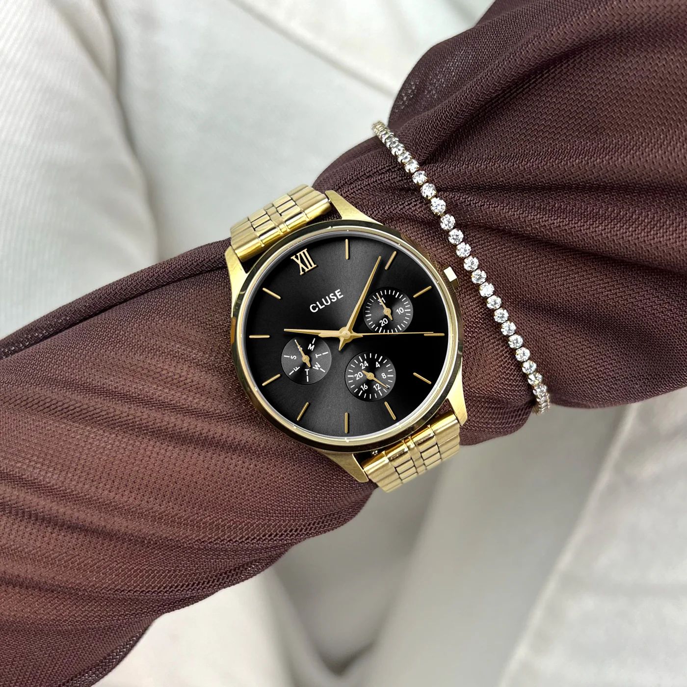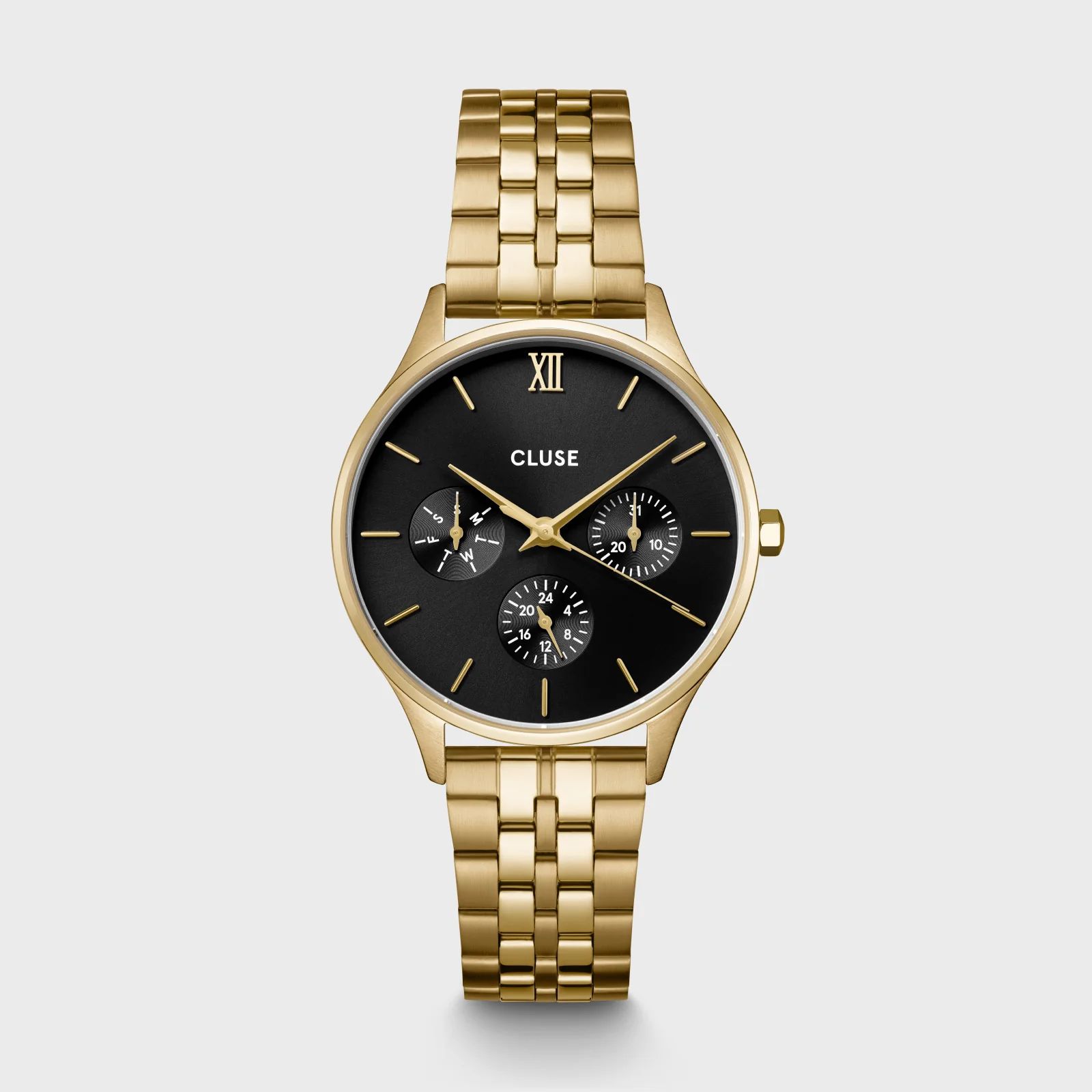 Boitier acier doré 34 mm, dateur multifonction