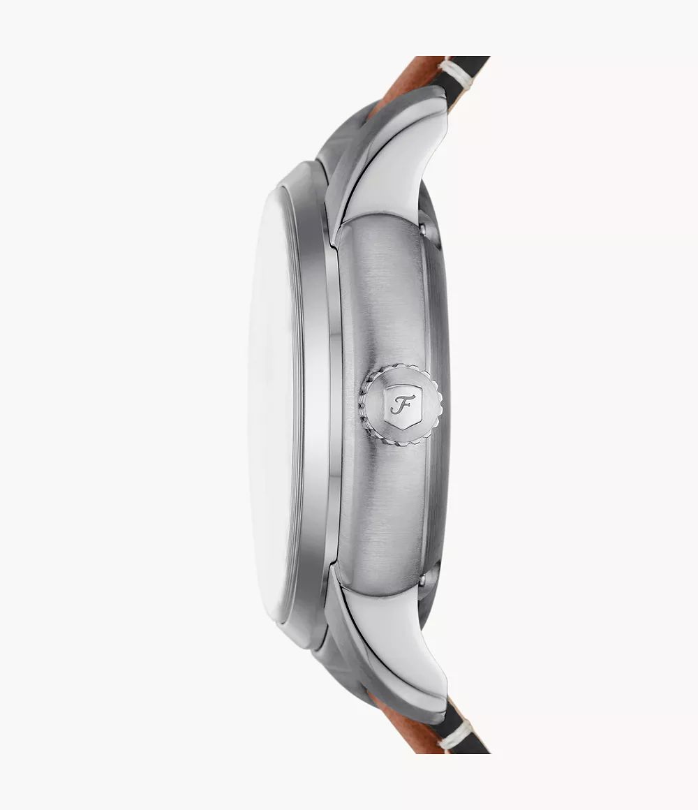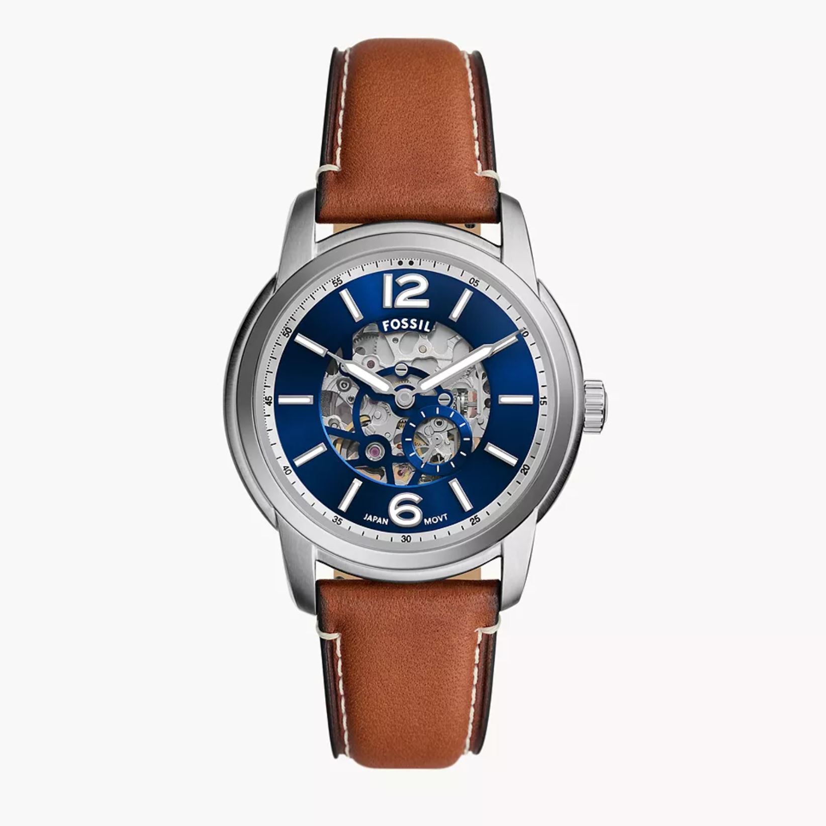 Boitier acier 43 mmmouvement squelette, fond bleu, cuir marron