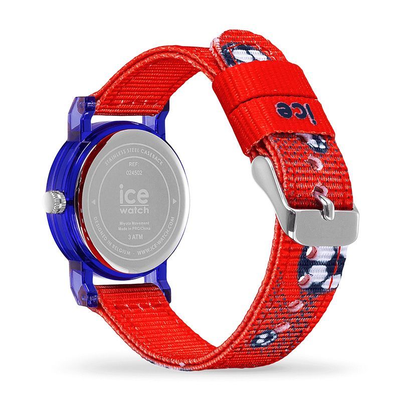 Boitier résine bleu 28 mm, bracelet nylon rouge motifs Football
