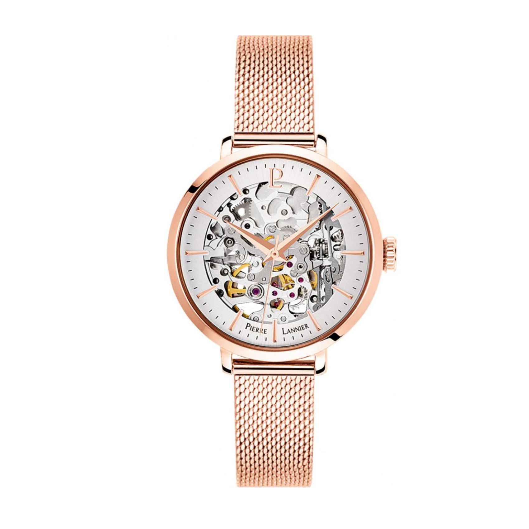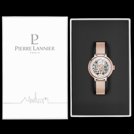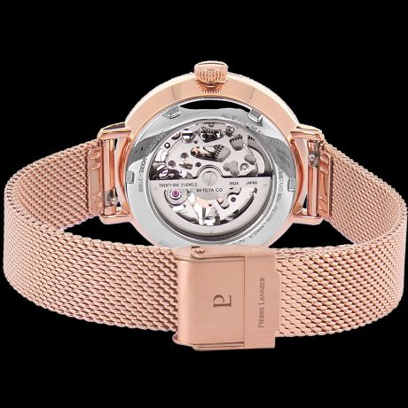 Montre femme automatique mouvement squelette, acier rose gold, bracelet maille milanaise rose gold, boitier 35 mm