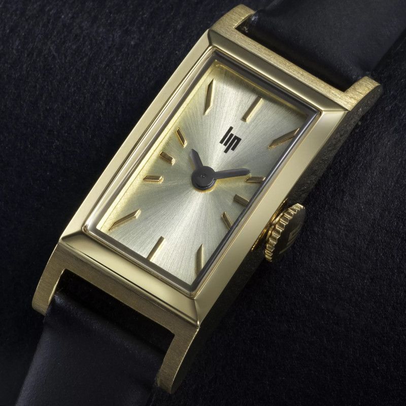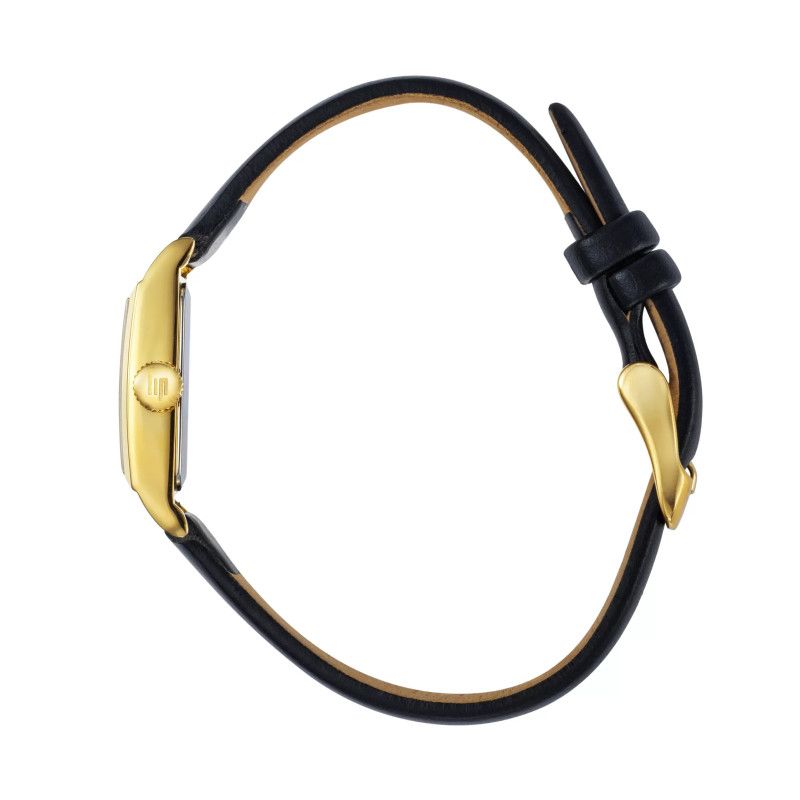 Boitier acier doré 13 x 29 mm, bracelet cuir noir