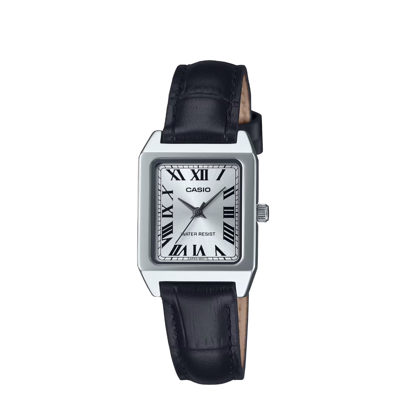 Montre femme rectangulaire acier 22 mm, Chiffres Romains, Cuir noir, Casio