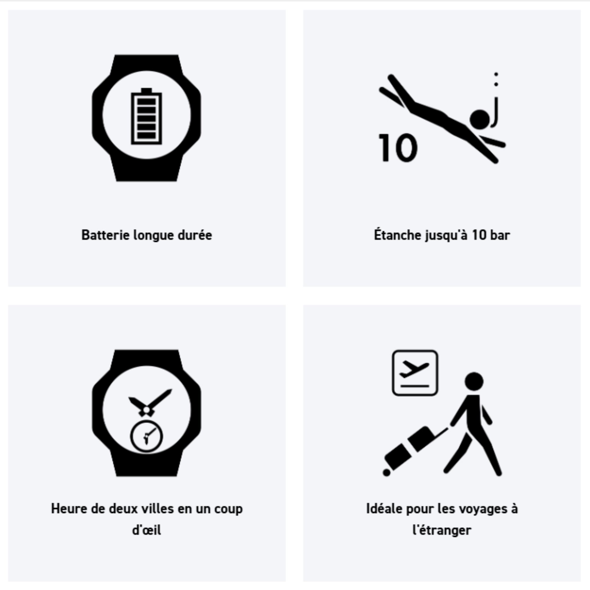 Pile 10 ans, étanche 10 ATM, affichage World Time, Dual Time