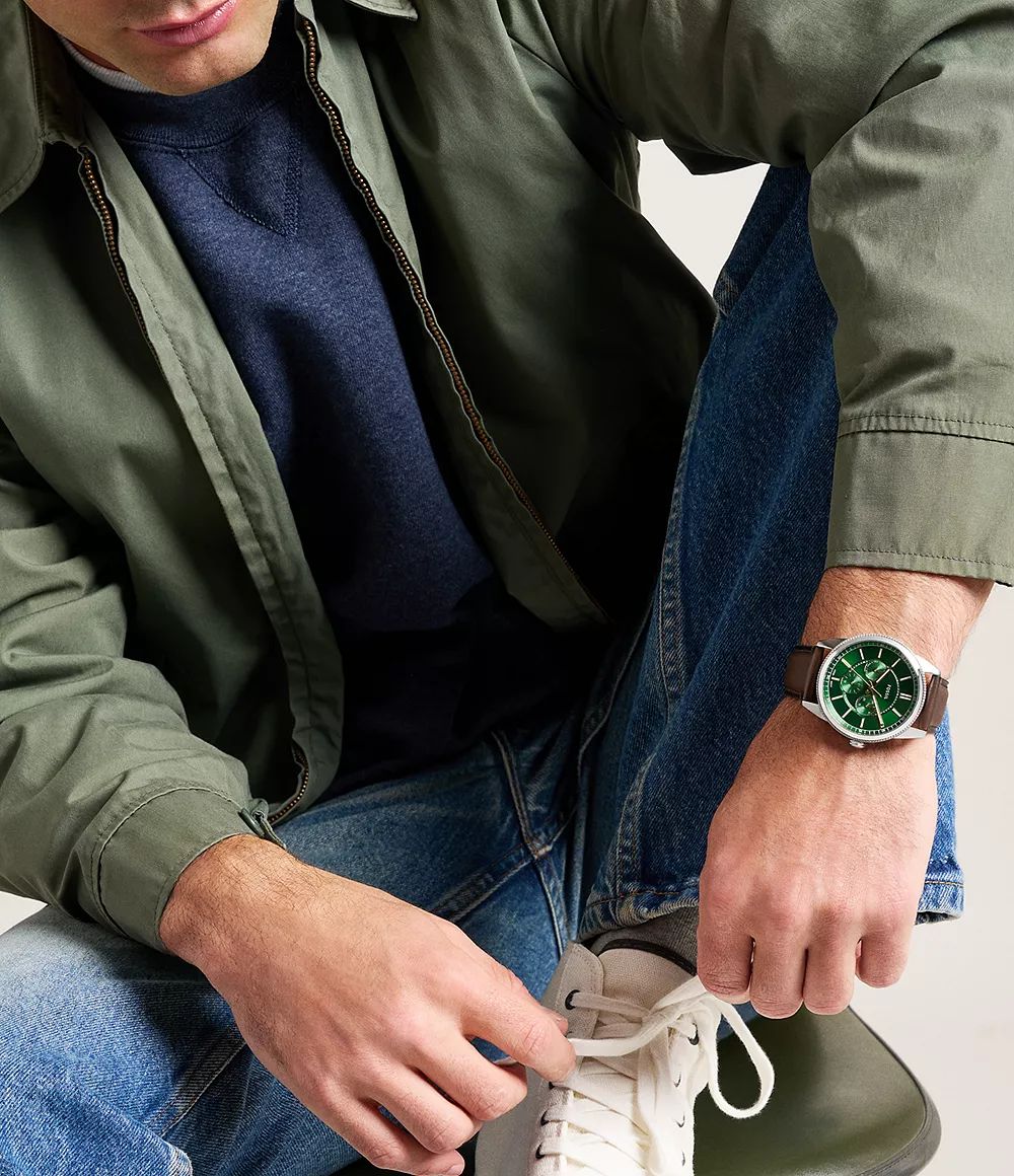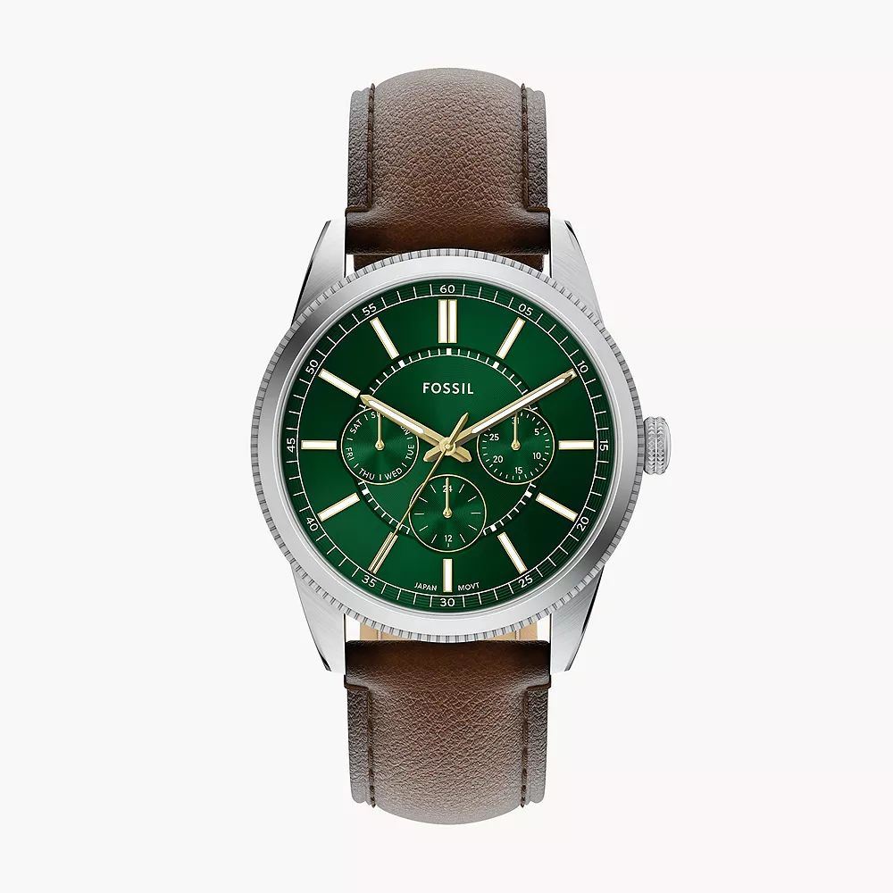 Boitier acier 42 mm, bracelet cuir marron, multifonction, 5 ATM