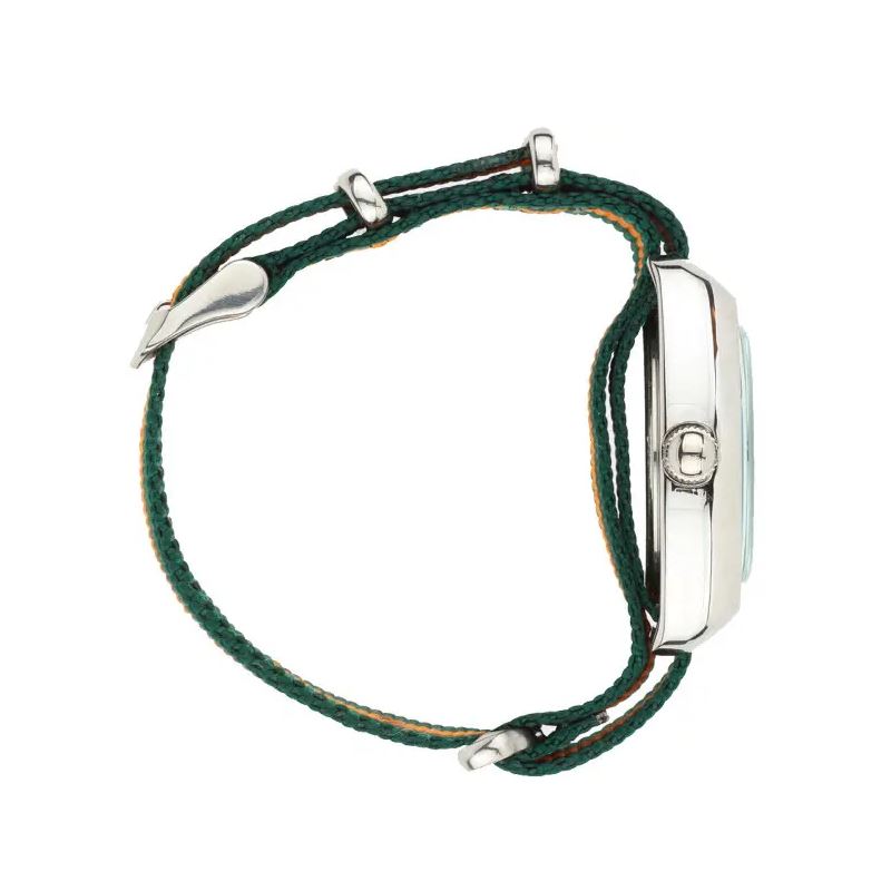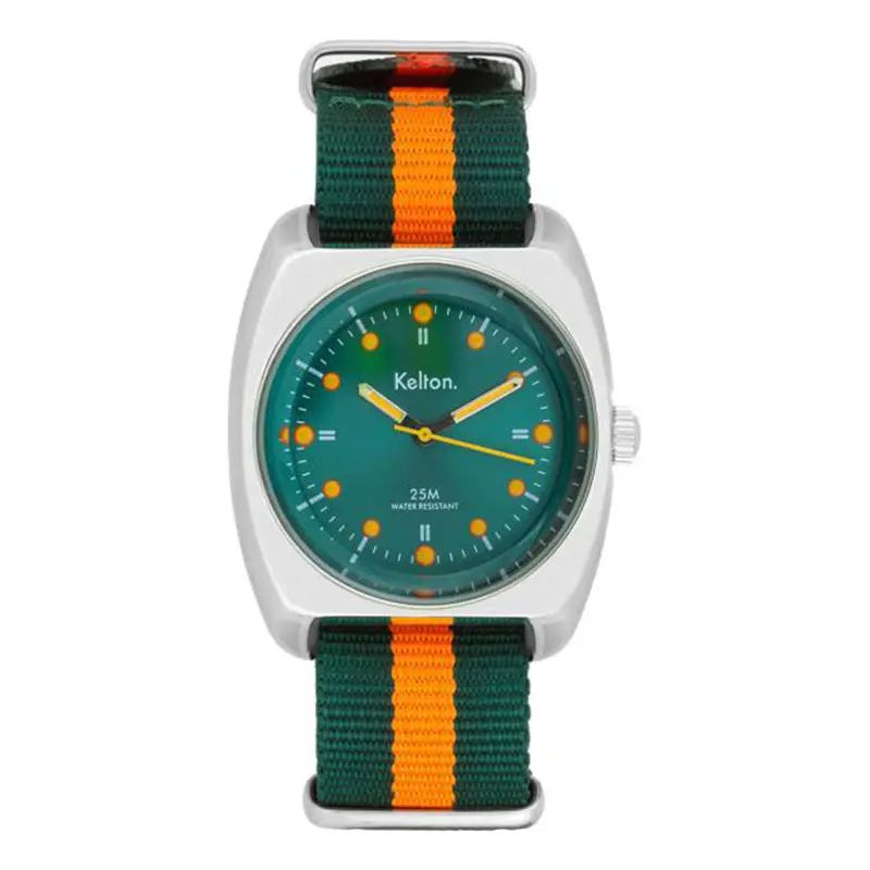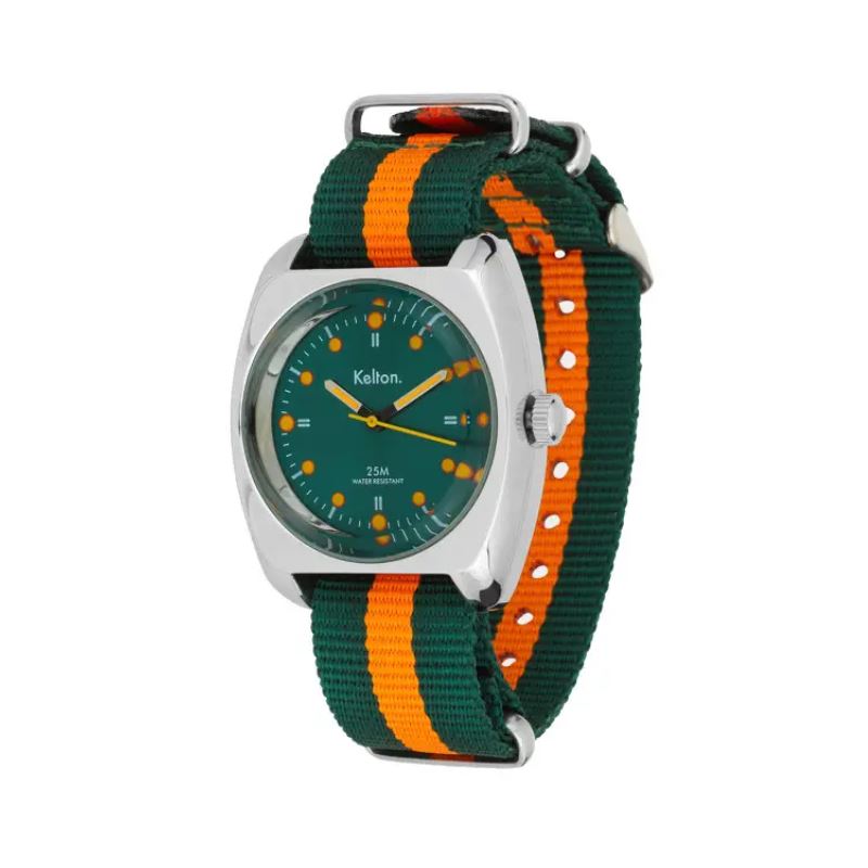 Avec son robuste boitier de muscle car, son cadran vert, ses index oranges et son bracelet
