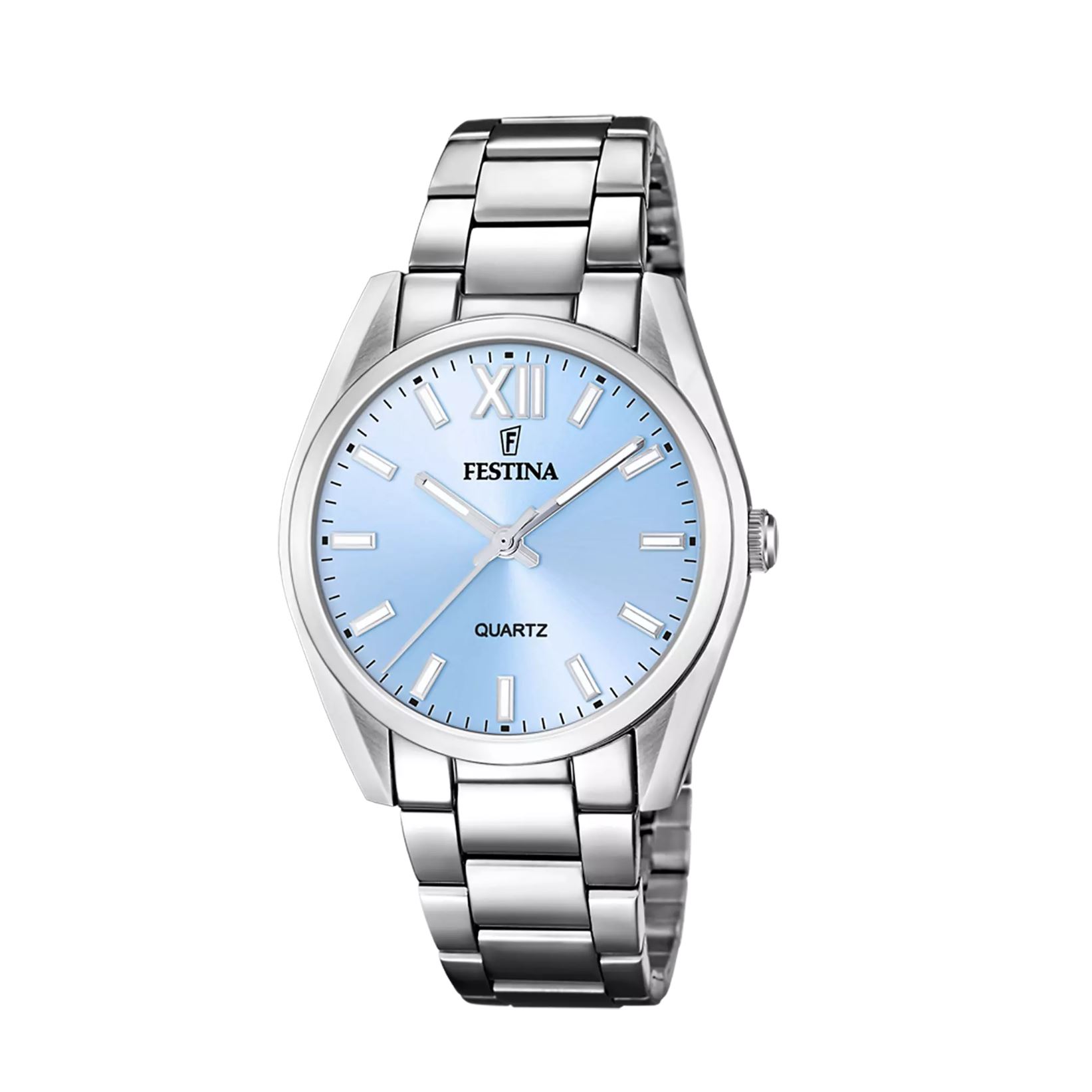 Boite 36.8 mm et bracelet acier, fond de cadran bleu, boucle déployante