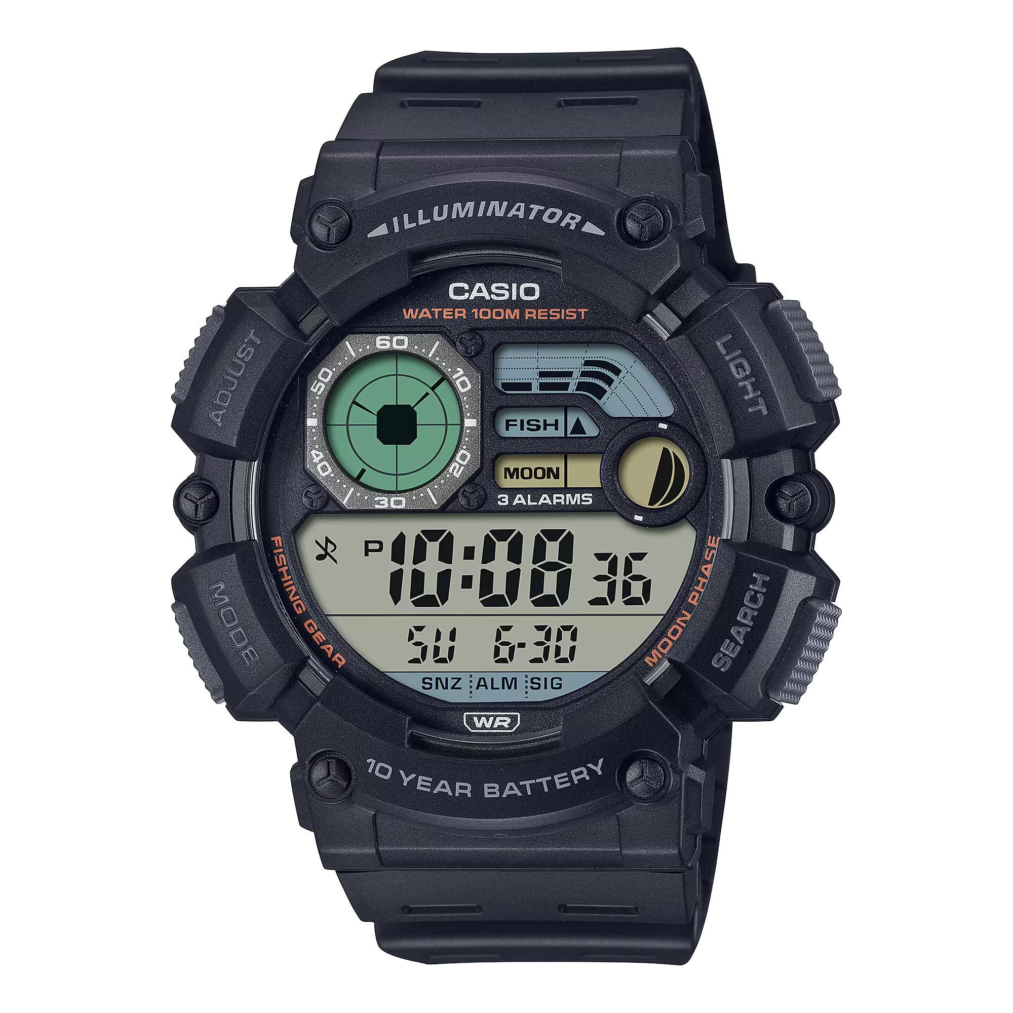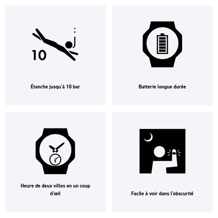 | Spécificité montres | Alarme, Chronographe, Compte à rebours, Dateur, Eclairage de l'écran, Marée / Lune |