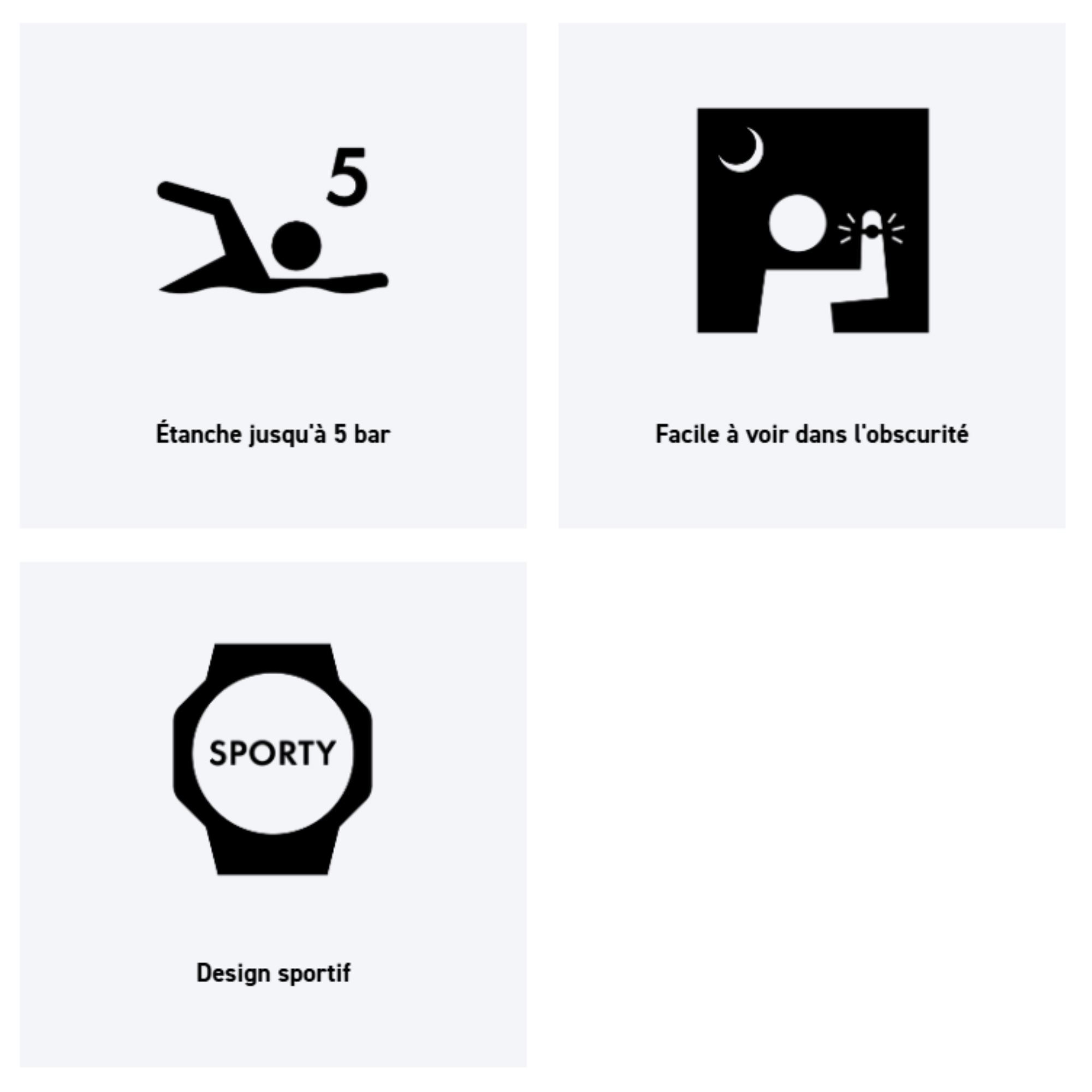 | Spécificité montres | Alarme, Chronographe, Compte à rebours, Dateur, Eclairage de l'écran |